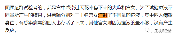 几天后,30位宫女们出现不同程度的发热,因为接种量无法精确把握,而且宫女们面临极大的恐惧感,有4位宫女因此而死亡。