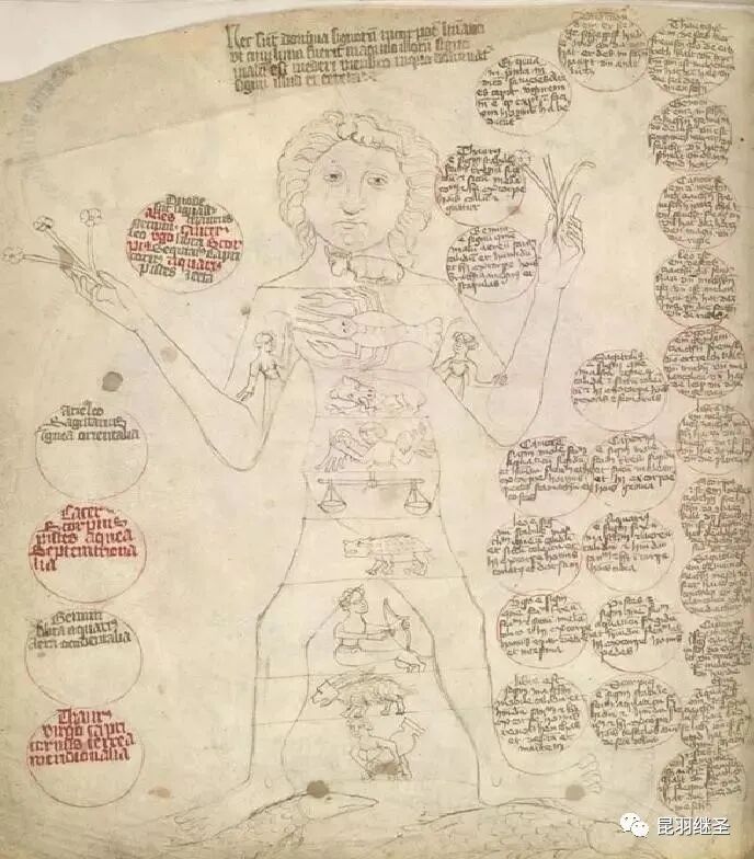 据说是1410年的黄道带人(Zodiac Man or homo signorum)插图,这幅图显示出古时的十二星座与人体各部分之间维持联结的关系