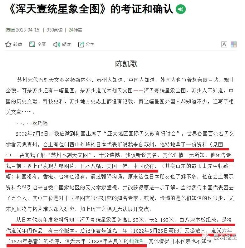 2002年7月6日,苏州市古代天文计时仪器研究所陈凯歌先生应邀去韩国参加一场研讨会,期间日本津山乡土博物馆的馆长西山雄峰拿出一个很模糊的照片向他询问有关苏州木刻天文图。然而,当时的陈凯歌对此知之甚少。