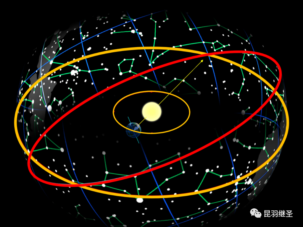 由于地球自转与公转的轴彼此有23.5度的倾斜,所以与地球自转相关的天球赤道和与地球公转相关的黄道也是互相倾斜。