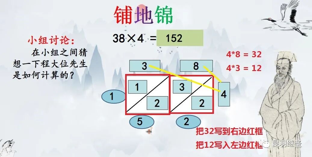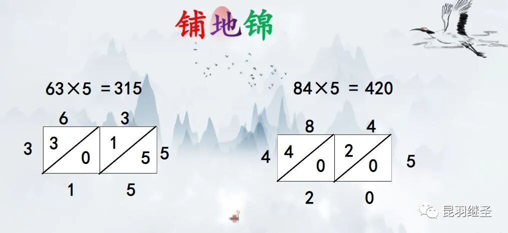 由于这种算法以实横列、以法直写,法与实犹如织布之“经线、纬线”,得经纬相错者乃成地,而法实相乘的结果,便如地纹上所镶嵌的花卉,故此,古人将之生动形象地比喻为——“铺地锦”。