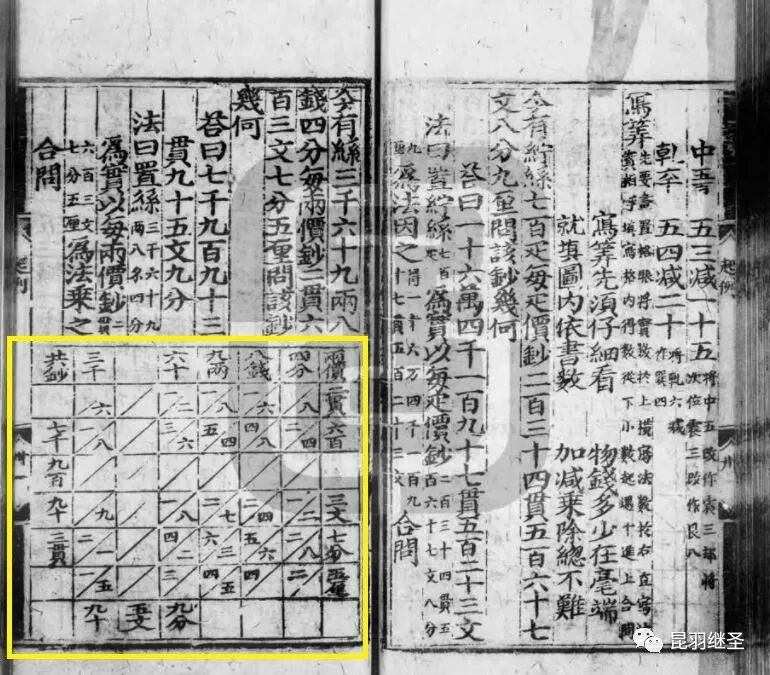 由于《算法统宗》在编写体例和内容上都受吴敬的《九章算法比类大全》的影响,所以顺着这条线索往下查,看看《九章算法比类大全》中是否有铺地锦这种方格乘法。