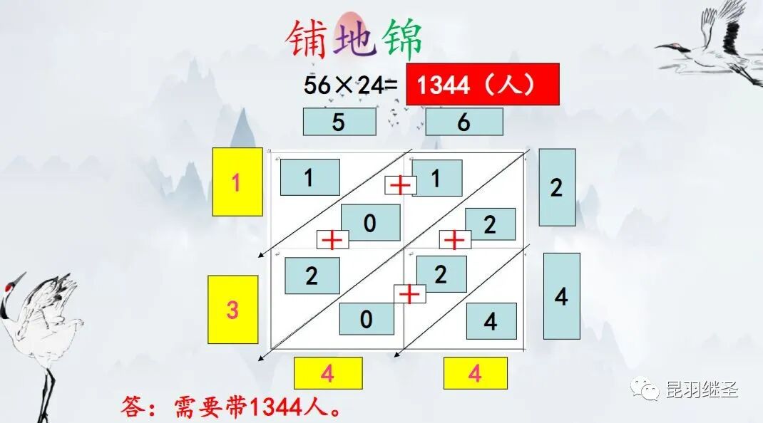 “铺地锦”写算法,是通过乘法分配率把复杂的多位值乘法计算简化为——个位数乘法和简单的加法计算,在运用九九乘法口诀的基础上,可以说相当简单。