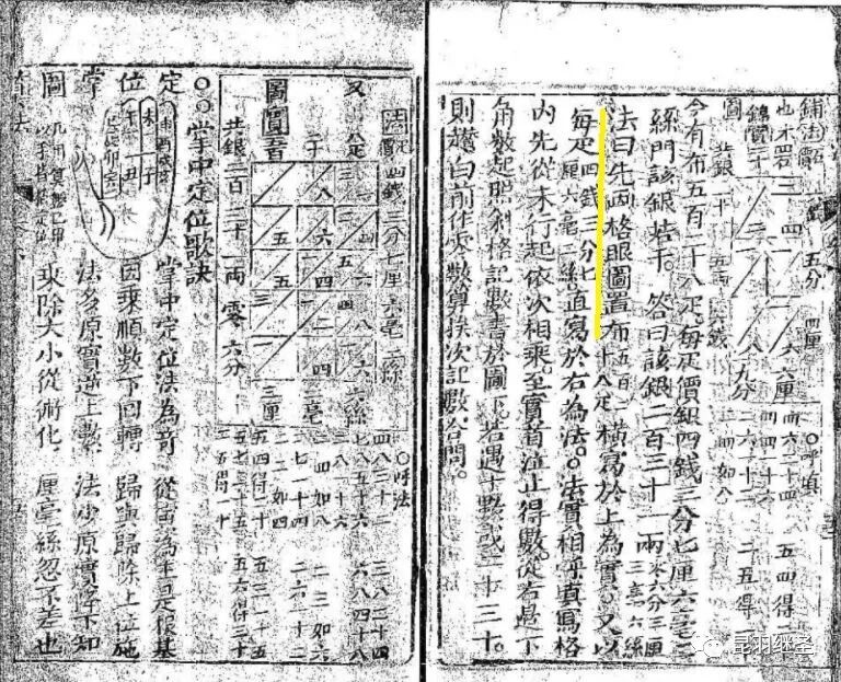 二、卷一、卷二,介绍数学名词、大数、小数和度量衡单位以及珠算盘式图、珠算定位法、九九表、九归诀、撞归诀、起一诀等等,并举例说明具体用法;