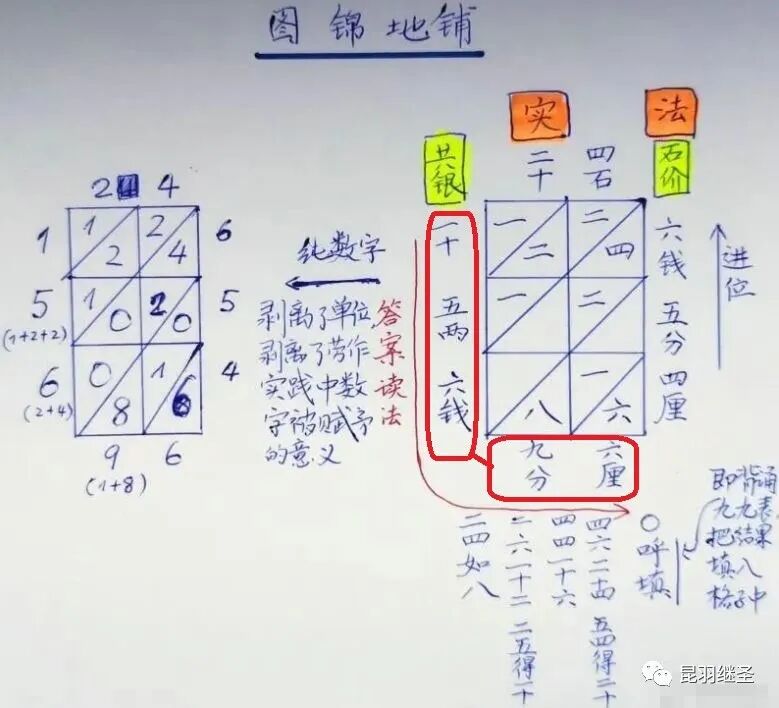 其实,铺地锦这种格子乘法是专门为生活中的买卖交易设计的一个便捷计算方式,尤其适合多单位十进制乘法计算,其中涉及了度量衡单位。