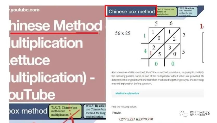 惊奇的事情发生了,在西方,这个格子乘法(铺地锦)居然经常被称作“Chinese box method”!!!又或是 “Chinese grid method ”、 “The chinese method of multiplication ”。