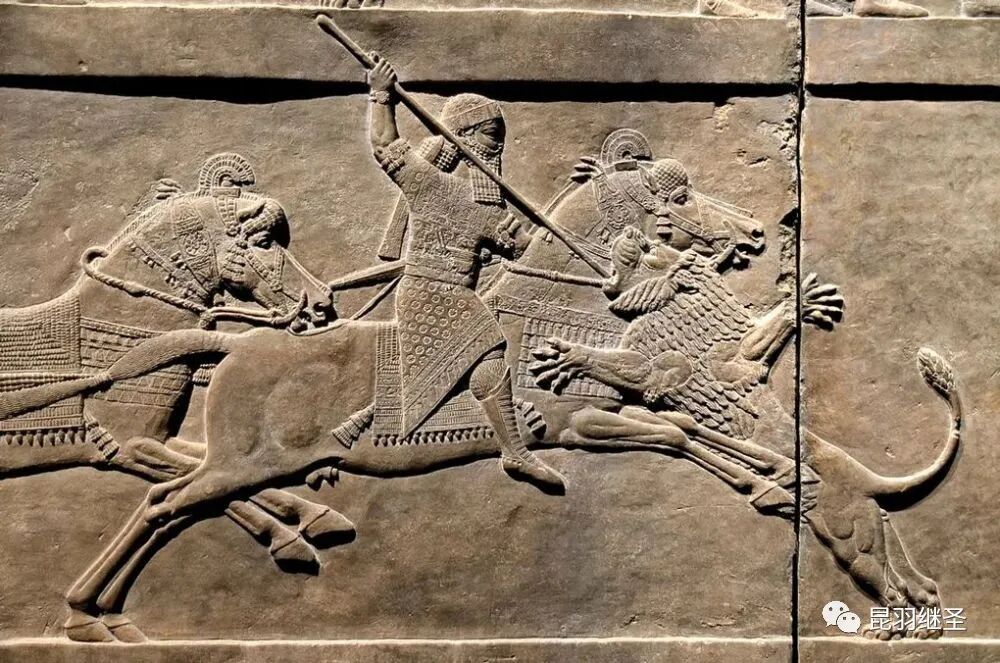 西人根据此图仿画了一幅所谓的亚述猎狮图,把猎豹换成了猎狮。