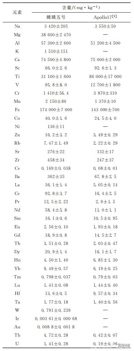 嫦娥五号月壤样品与阿波罗17号样品元素含量对比图