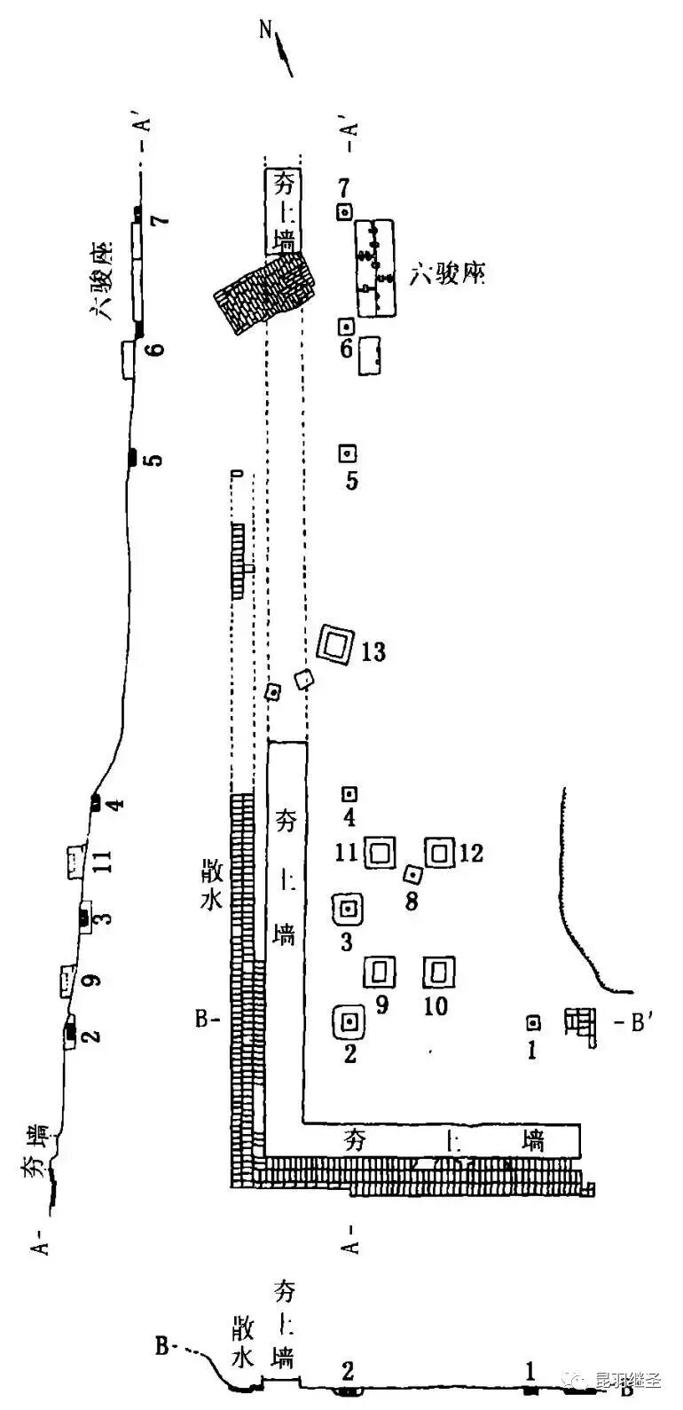 2002年发掘的昭陵北司马门西廊房遗址(ZLJIF4)平剖面图,十四蕃君长像和六骏像中的一半原先就安置于这座建筑内,发掘显示部分基座尚在原位。采自陕西省考古研究所,昭陵博物馆:《2002年度唐昭陵北司马门遗址发掘简报》。