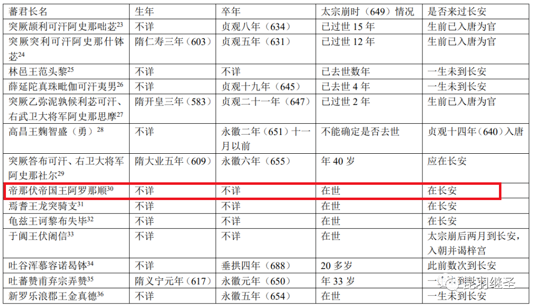 根据《旧唐书》卷一百九十八《西戎传》(中华书局,1975年,第5308页)、《新唐书》卷二百二十一《西域传》(中华书局,1975年,第6238页),阿罗那顺是在贞观二十二年(648年)五月帝那伏帝国被王玄策所破后被俘至长安的,唐太宗(599年1月23日-649年7月10日)驾崩时,他显然在长安。