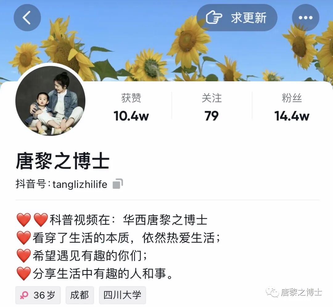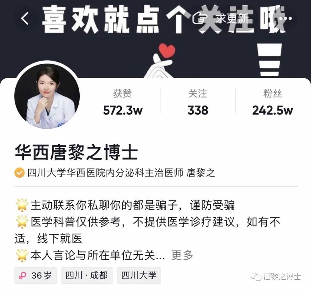 通过抖音(抖音搜索:华西唐黎之博士/唐黎之博士)平台,我可以在一场科普直播里帮助比平时上门诊看一年的患者都多。在这里我也要谢谢各位粉丝朋友的信任和反馈。