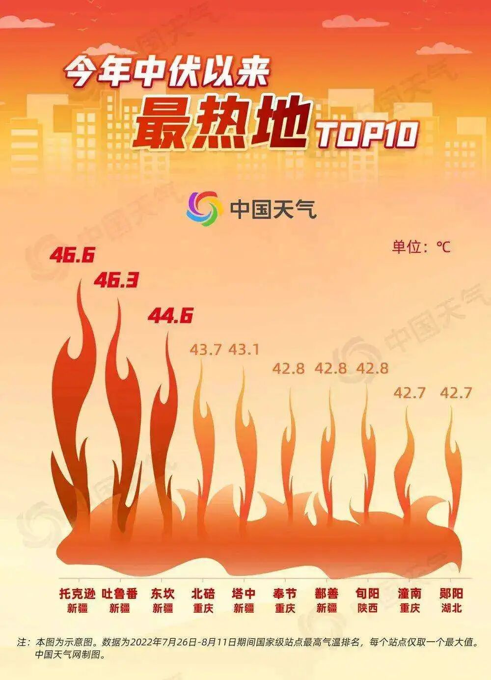 当然,从今年中伏天的最高气温来看,其中最高的气温是在托克逊,最高气温达到了46.6℃,看到没?我国中伏出现近47度高温,可以想象下,这个区域的人怎么生活,难以置信。