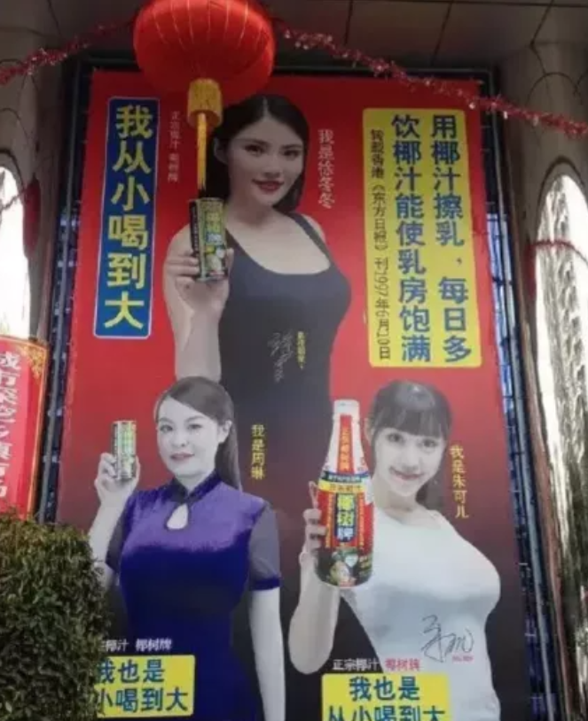 海南的椰树集团那句“从小喝到大的”广告语自从出现就始终伴随着争议不断,甚至因为此事被海南省市场监督管理局以“妨碍社会公共秩序或违背社会良好风尚”被罚了40万。毕竟这句广告语在配合上代言人身材和动作,一语双关很明显啊。