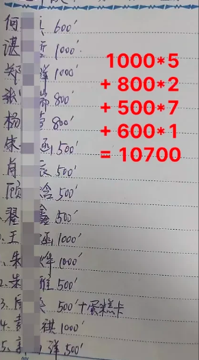 一页纸上写有15人,总计收礼10700。这一页的人名写满到了最后一行,不知是否还有第二页和第三页。