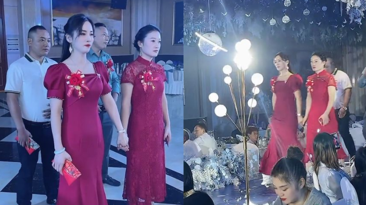 两位妈妈都穿着喜庆的红裙子,看起来都是那么的端庄漂亮。两个人牵手款款走来,不认识的人还真的会把她们给认错了。