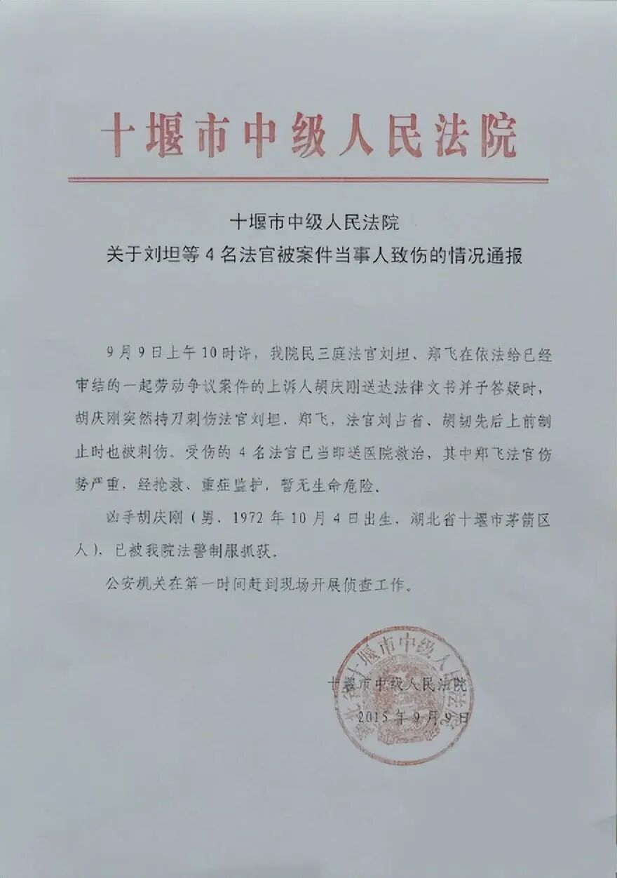 2015年9月9日,农民工胡庆刚状告公司克扣薪资,十堰市中级人民法院二审判决其败诉并禁止上诉,胡庆刚恼羞成怒,情绪失控持刀在法院内将4名法官捅成重伤!42岁的犯罪嫌疑人胡庆刚家住茅箭区张家巷。2014年,胡庆刚向方鼎公司发放克扣的薪资未果,遂向十堰市劳动人事争议仲裁委员会申请仲裁。十堰市劳动人事争议仲裁委员会要求胡庆刚出具与方鼎公司签订的劳动合同及能够证明方鼎公司欠薪的书面证据。胡庆刚却一个也拿不出来,十堰市劳动人事争议仲裁委员会裁决驳回其仲裁请求。
