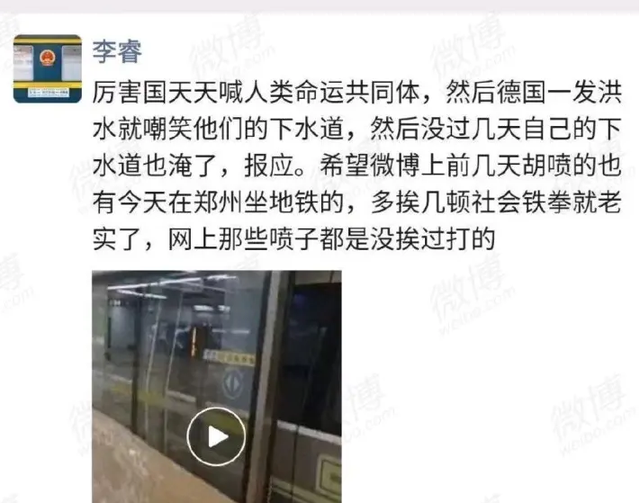 李睿不仅学习成绩优秀,而且兴趣爱好广泛。他热爱摄影,上学期间的许多摄影作品常年出现在清华大学,以及不少学生组织的宣传版面之中。毕业后,他顺利入职有着央企背景的远洋公司工作,年薪从开始时的几十万逐渐上升到上百万。如果不是李睿在2021年7月的出言不逊,估计全中国人也没人知道他。当年河南郑州发生特大暴雨,给河南人民造成了不可估量的损失和悲痛。全国人民都在为河南加油、祈福和援助,李睿竟然在网络平台上扬言河南人遭暴雨被淹是报应,是活该。有网友看不下去,反驳他几句,他不知悔改,竟振振有词嘲笑:“没挨过打的喷子”。