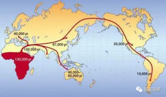 根据非洲起源论的观点,所有现代人的祖先,都是20万年前的一位东非女子,西方人将她命名为“夏娃”,大约在13万年前,“夏娃”后代走出非洲,走向欧洲、亚洲、美洲、大洋洲等地,没有与当地古人类有过丝毫杂交,完全取代了当地古人类。其中,大约5万年前,非洲智人来到中国,取代了原先的古人类。