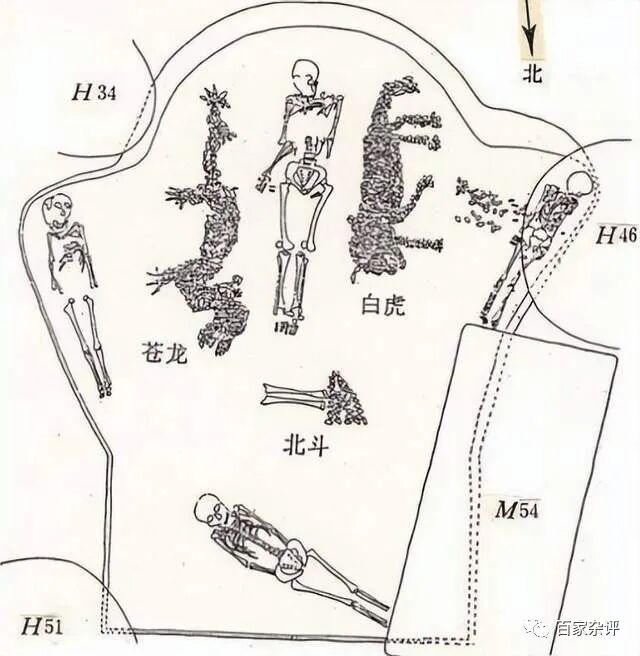 西水坡遗址由自南向北的四组墓葬组成,彼此间隔25米,都处于一条南北子午线上。其中,最北墓葬的墓主两侧,分别摆放蚌壳制作的龙与虎(虎腹下方的蚌壳表现的是“大火星”),脚下是一堆蚌壳与两条腿骨组成的北斗图。因此,这是一幅标准的青龙、白虎、北斗星象图,说明28星宿属于中国原创本土文化,最晚产生于6500年前。
