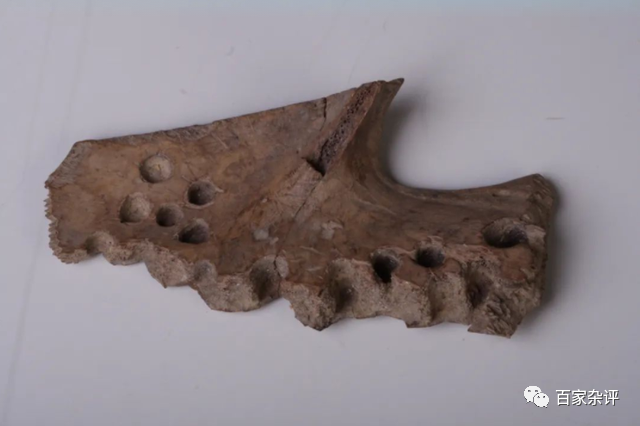 相关介绍显示:毘山遗址发现宽达15米的人工河,大面积的居住建筑遗迹,还有一个3400平米的“地标”建筑,遗址占地面积在百万平米左右,还有青铜礼器残片、烧灼过的龟甲、玉琮、玉璧等数百件,是浙江地区规模最大、等级最高的晚商时期聚落。(下图,卜骨)