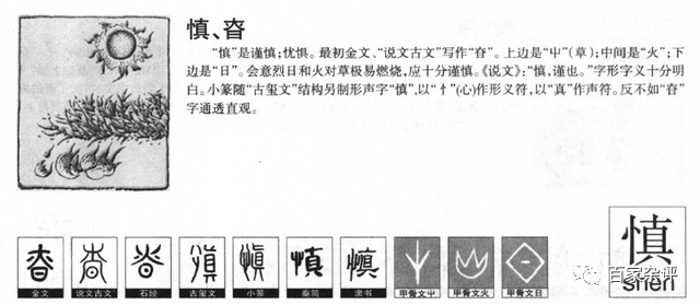 从文字角度来说,甲骨文中的农字,是手持农具除草或除去林木的象形,相当于农业的第一步——开荒除草;慎字最早见于周代金文(见上图),由“草”、“火”、“日”组成,与农业也有一定的关系。