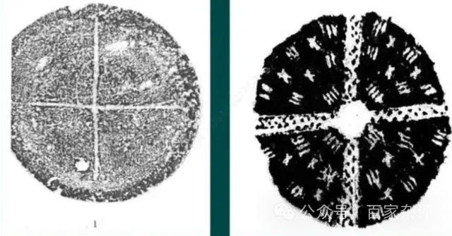 湖北秭归“柳林溪遗址”,其中出土了一件圆形陶器(见上图)。显然,上图横竖交叉的就是二绳,中心点还被特意标出,应该是象征太阳。