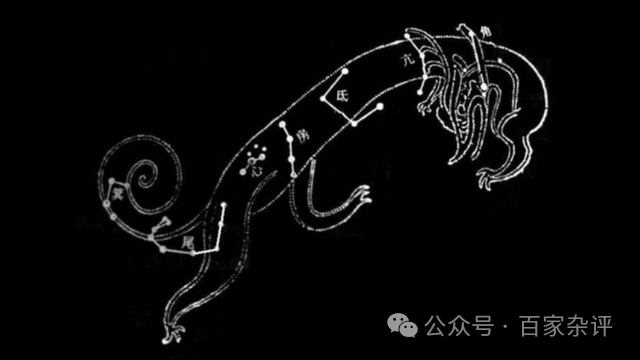 甲骨文中的龙字(见上图),是一种大口长身的怪兽,在自然界中找不到与之对应的生物。但如果观测青龙星象,却会发现两者高度一致(下图)。