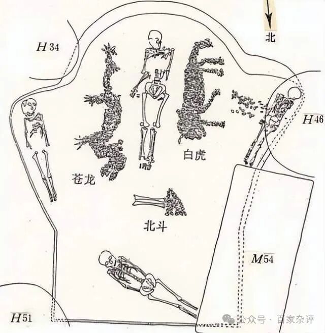龙虎大墓,三个殉人、蚌壳龙虎、北斗,以及墓主(见下图),犹如墓主生前所处的世界。其中,需要注意的是墓主头朝正南!