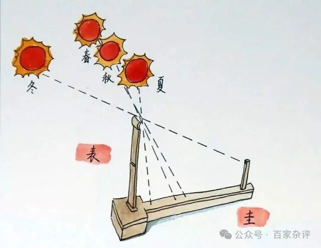 中国天文传统之一,就是“立表测影”,当用来观察季节或时间时:首先“立表”,确保“表”不偏不倚,其次是放置与之垂直的圭尺,第三是观察正午日影在圭尺上的“勾”出的日影长度,由此判断季节或时间。