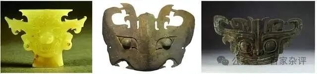 下图,左为石家河玉面具,中为湖北武汉盘龙城商朝青铜面具,右为三星堆青铜面具