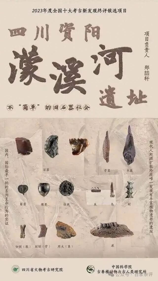 2023年,在四川资阳乐至县的“濛溪河遗址”,出土石器、动物化石及碎屑10.5万余件,另有数以万计的植物遗存和少量木器、骨器及其它遗存。其中,很多骨器、石器等上存在人工刻痕,推测有切割、刻划、用火等痕迹,甚至还有“X”形的刻画符号(见上图)。