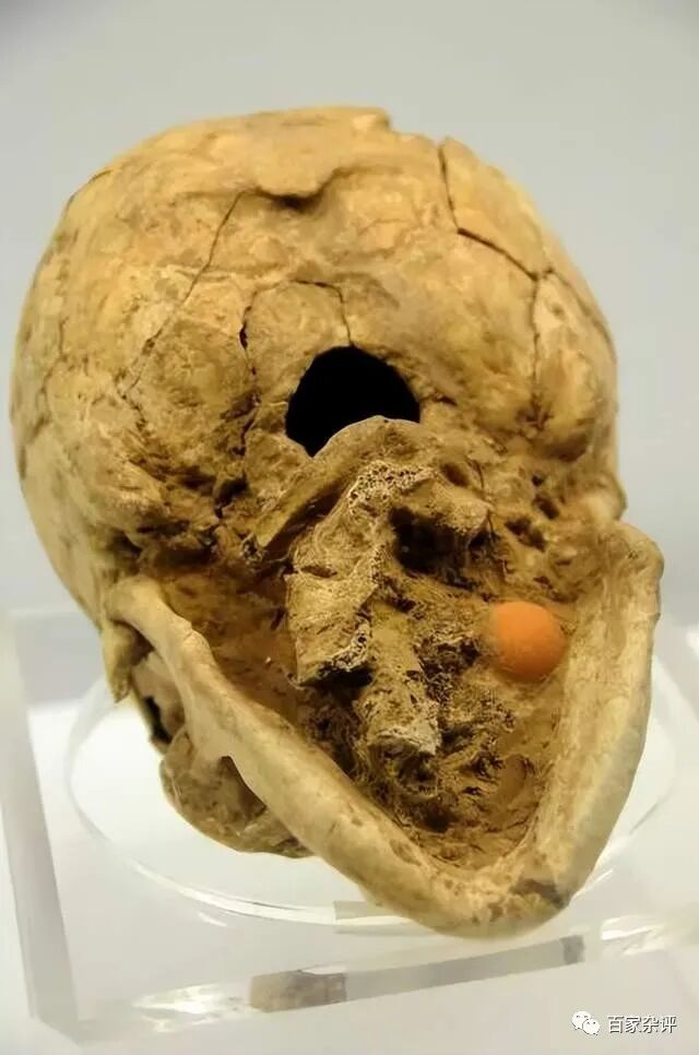 也就是说,“口颊含球”不是普遍性现象,而是大汶口文化中的少数行为,根据出土情况来看,他们在部落中的地位较高。(下图,山东泰安大汶口遗址头骨,含有陶球,女,40岁左右)