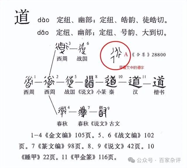 甲骨文中的行字,是十字路口的象形,道字在里面多了一个人,表示人在路上行走。其中,在周代金文“道”的字形中间,用代表人头的“首”替代了“人”。