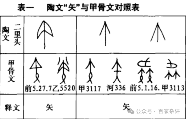 其中,下图陶文与甲骨文对比表明,上图1在甲骨文上有相似字形,对比下图甲骨文的部分可知,上图2—4也有相似字形,这种巧合只能说明二里头陶文上的这一符号为“矢”。