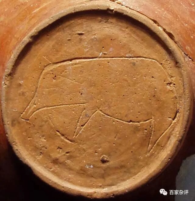 更为重要的是:双墩刻符中的不少刻符被反复使用,且不少刻符在江苏镇江、安徽宣城等遗址中被发现,这些现象无疑说明双墩刻符是一种表达特定含义的记录符号,具备了文字的特性;同时,双墩刻符中出现两个或两个以上的符号组合,可以表达相对完整的意思,已经具备了语段文字的特点;此外,双墩刻符具备了象形、指事、会意三大造字方法,而甲骨文已具备“六书 ”(象形、会意、指事、假借、转注、形声)的汉字构造法则。(下图一个双墩刻符,猪纹,相信大家都可能辨别出来)