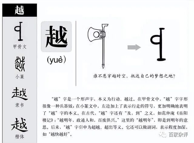问题在于,学者解读有无根据呢?其实,“钺”、“戉”、“越”的最初文字都是“戉”,一个象形符号,权力的象征——斧钺。下图甲骨文中的“戉”,与上图2几乎一模一样,因此澄湖刻符中的第二字基本可以肯定为“戉”。