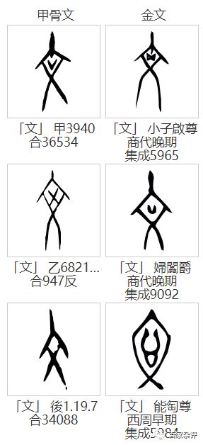 到了商代之后,这个字略有变化,但基本还是一致。根据商代甲骨文、金文记载,这个字叫“文”。