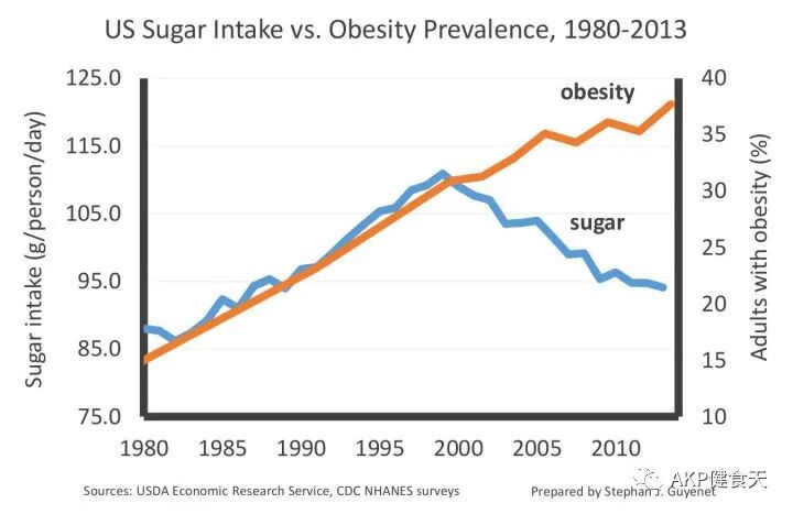 此外,在过去的二十年里,糖的消费量实际上已经下降,而肥胖症却继续上升: