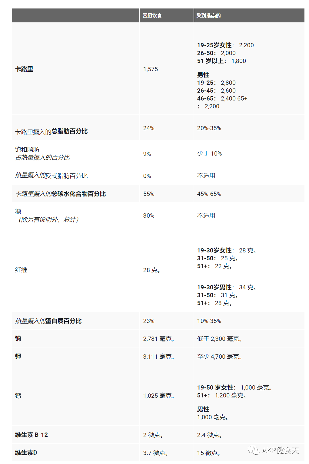以下是一天容量饮食的营养成分明细,以及美国联邦政府 2020-2025 年美国人膳食指南的建议。