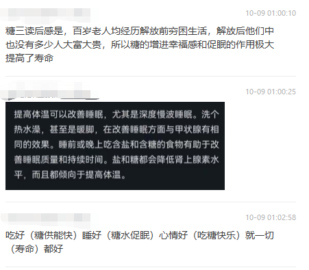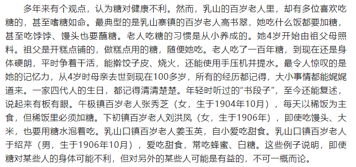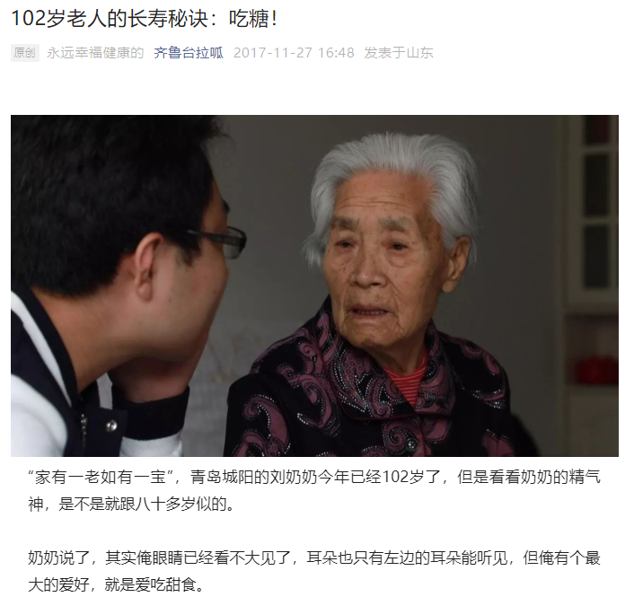 从小我们就被教育要少吃糖:但采访的一个103岁奶奶,一个月要吃6斤冰糖,为了躲避家人检查,把冰糖藏在床头柜子里,这样夜里醒了,顺手就可以摸到一颗,放在嘴里,甜甜睡去……各种养生鸡汤里说甜品不能吃,但我采访的那位107岁徐老,他祖籍昆山,视甜食如命,现在依然。