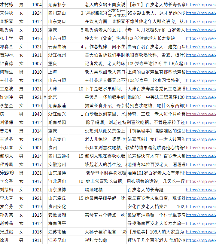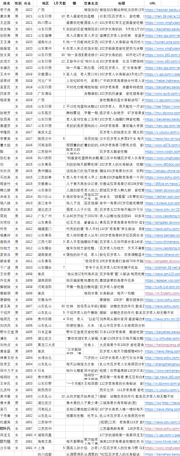 下表是《糖是长寿秘诀之一》和《糖是长寿秘诀之二》综合整理表(以年龄升序排序):