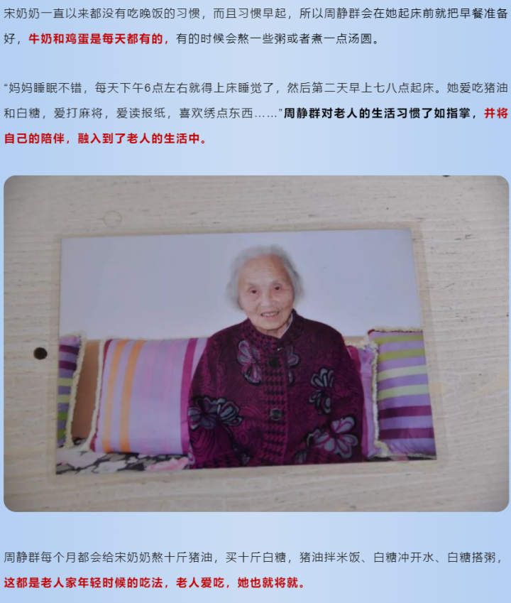 周静群每个月都会给宋奶奶熬十斤猪油,买十斤白糖,猪油拌米饭、白糖冲开水、白糖搭粥,这都是老人家年轻时候的吃法,老人爱吃,她也就将就。
