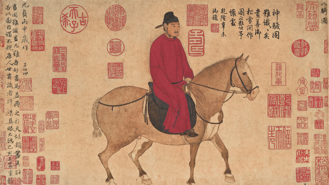 赵孟頫的《人骑图》作于 1296年,这张图画一着唐代官服者执鞭骑马,仪态雍容不凡,很可能是赵孟頫自己的自写小像。