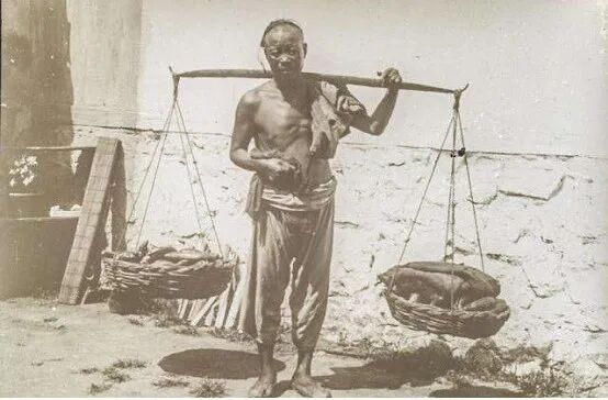 清末老照片,一个男人挑着一担番薯,这是当时穷人的主食