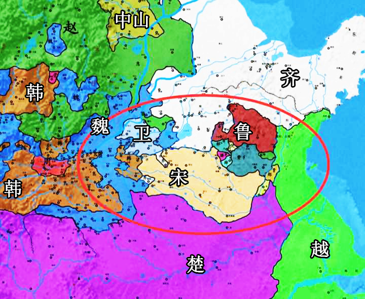 西边,南边有泗上十二诸侯——有宋,鲁,卫三个千乘之国,还有邳,滕、薛、邹一批百乘小国。
