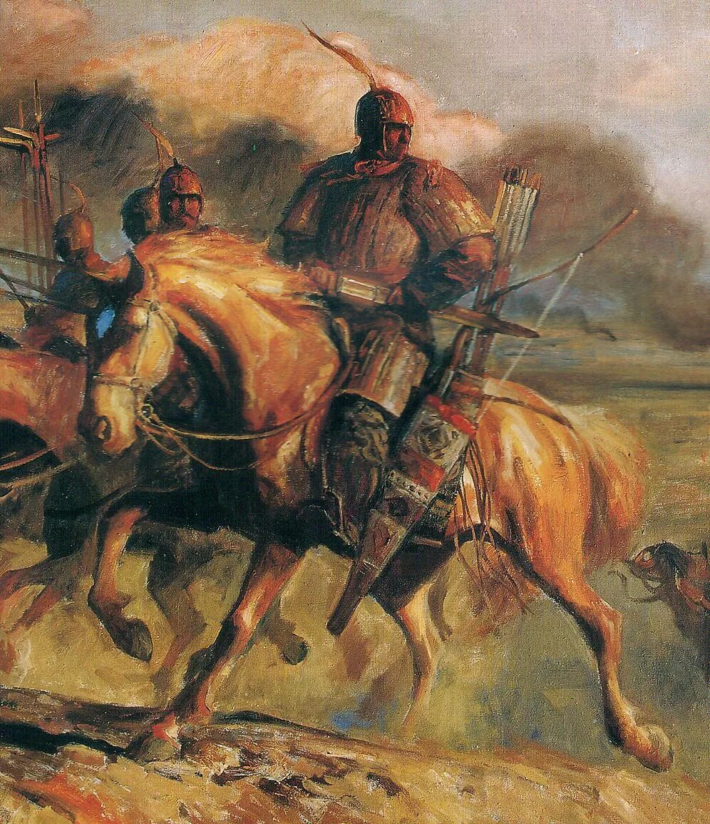 远远看到城楼上,飘着五色旗,郅支单于率几百人披甲而立;