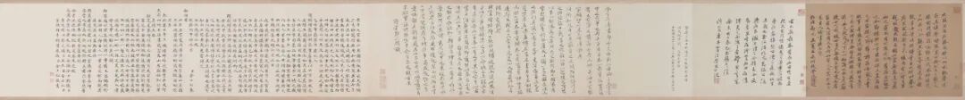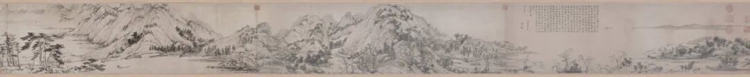 完整的纸本《富春山居图》,长 33 厘米,宽约 700 厘米,表现的是富春江一带连绵不断的山川景色。