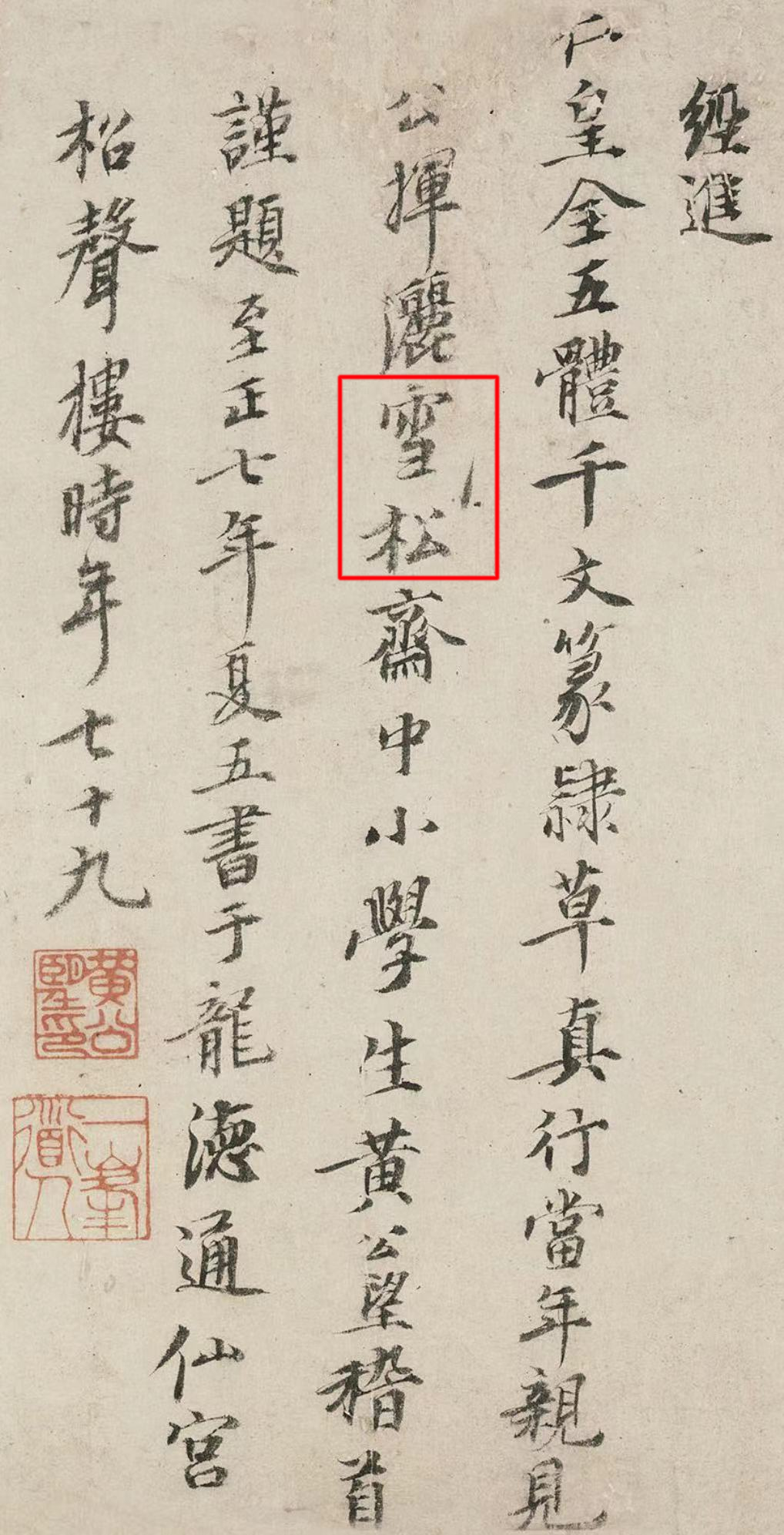 而大大有名的“松雪斋中小学生”一句,黄公望在跋文中却写成了“雪松斋中小学生”。