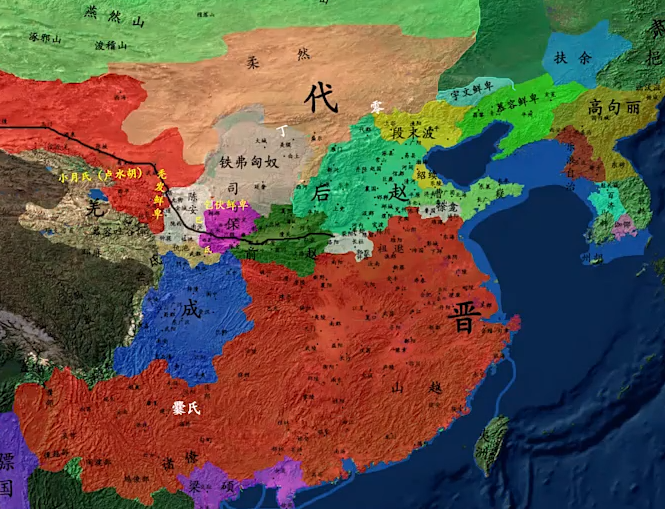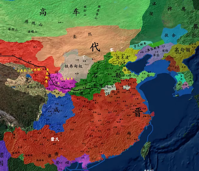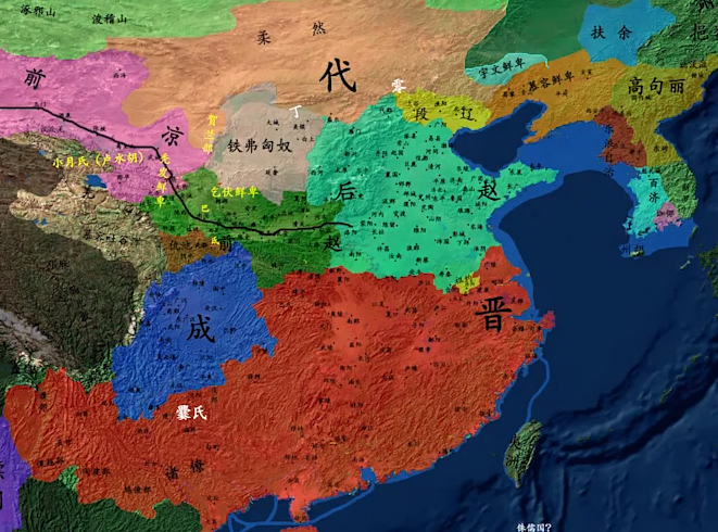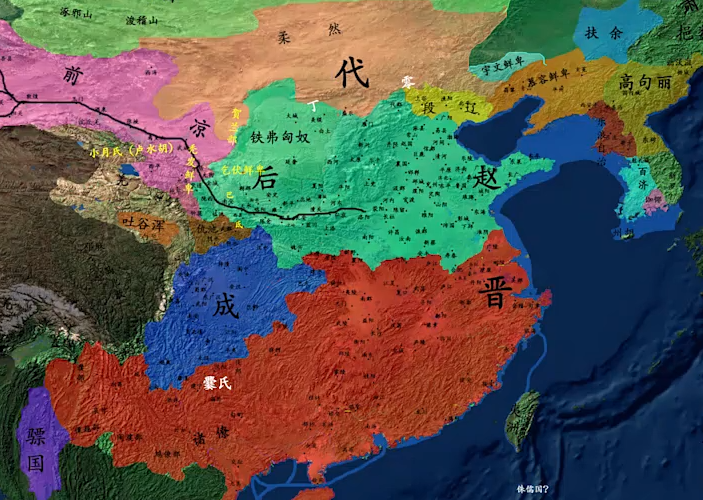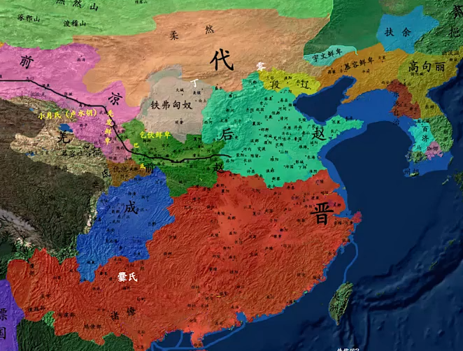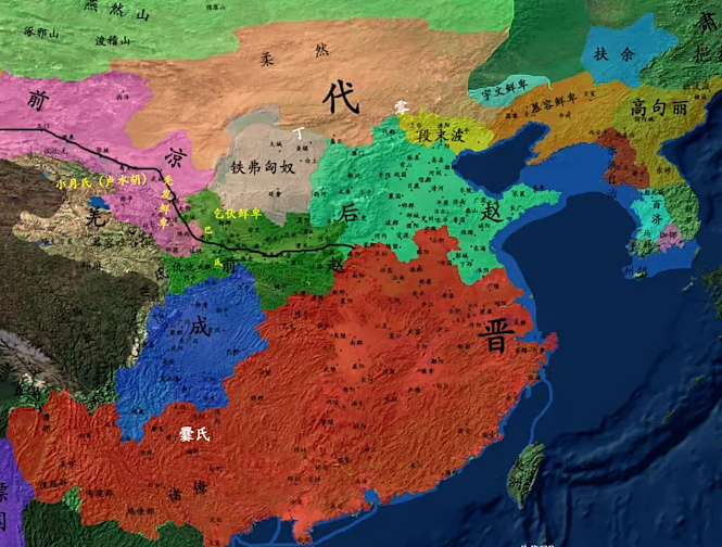 经过一轮又一轮厮杀,天下呈现四国并列的局面:江东的东晋、华北的汉赵、巴蜀成汉、西北前凉。