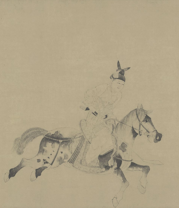从湖边飞驰而来一匹骏马,马上一青年,英姿飒爽,身穿戎服,臂架飞鹰,径直飞马到酒席前坐下,睥睨四处,叫人拿酒来。